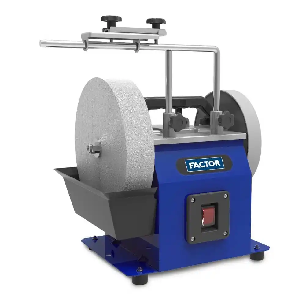 Factor OBW250 Sulu Bileme Makinesi; düşük devirli ıslak taşlama sistemiyle bıçak ve marangoz el aletlerinde ısınma yapmadan, profesyonel keskinlik ve kusursuz finiş sağlar.