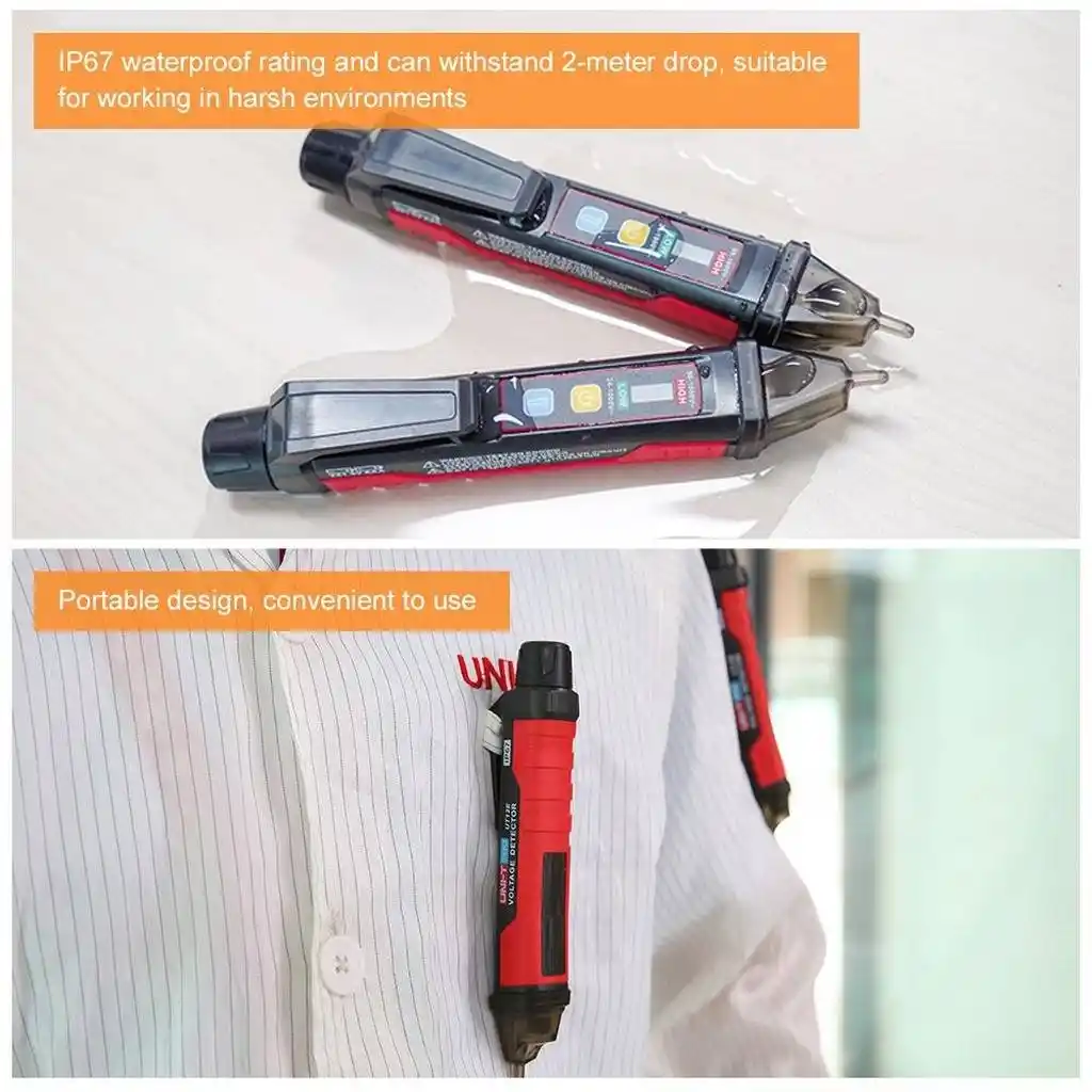 Uni-T UT12E Temassız Voltaj Test Kalemi: 24V-1000V geniş aralık, IP67 su geçirmezlik ve vibrasyonlu uyarı. Profesyoneller için güvenli ve dayanıklı AC voltaj dedektörü.