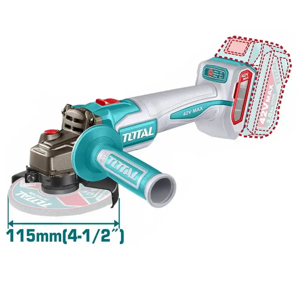 Total TAGLI4108112E, 42V yüksek voltaj platformunda çalışan, fırçasız (Brushless) motor teknolojisiyle donatılmış ve 115 mm disk çapına sahip profesyonel bir kablosuz taşlama makinesidir.