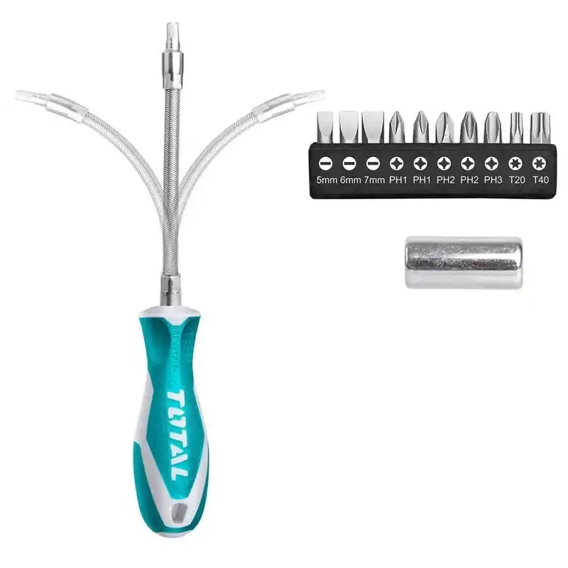 Total THT250FL1206 12 Parça Esnek Tornavida Seti, farklı vidalama ihtiyaçlarınıza uyum sağlayan pratik bir setdir. Bu set, SL5 - SL6 - SL7 - PH1 - PH2 - PH3 - T10 - T15 - T20 - T25 gibi toplamda 10 farklı tornavida ucu içermektedir. Ayrıca, 4-6 mm adaptör de setin bir parçasıdır.