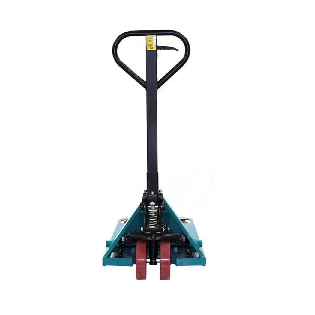 Yüksek hızda ve düz arazide hareket etmeye yardımcı olmak için tekerleklerle donatılmış büyük manuel forklift.