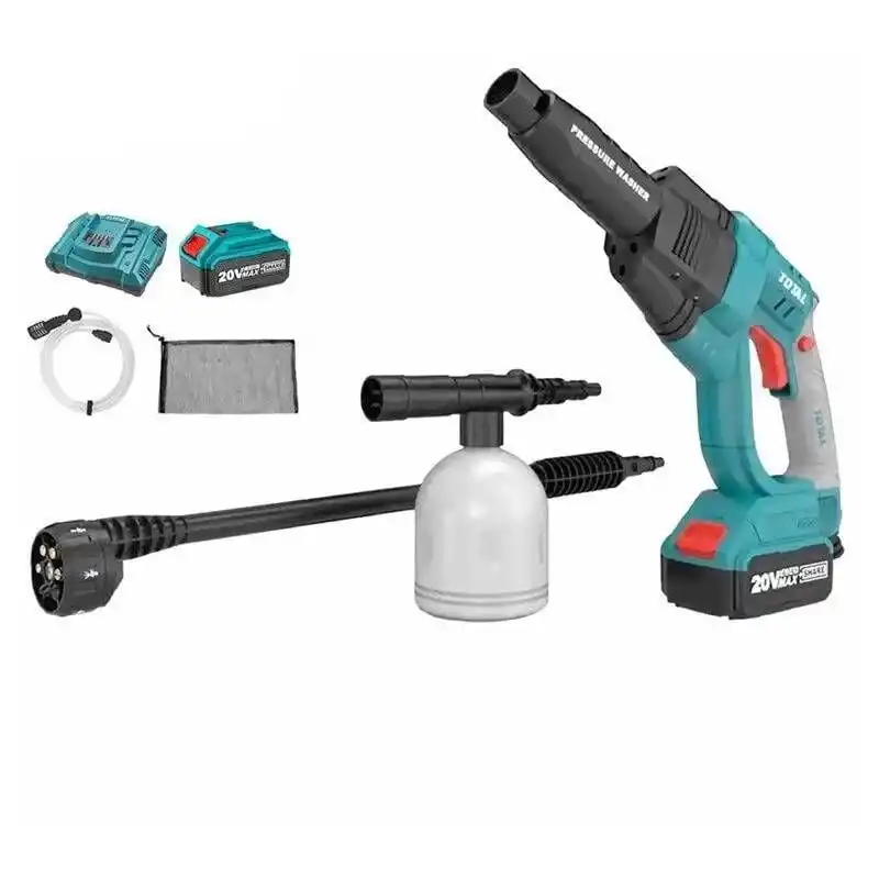 Total TPWLI20084 Akülü Basınçlı Yıkama Makinesi 20V 2.0Ah 24,8 Bar, yüksek basınçlı su jeti sayesinde araçlarınızı, bahçe mobilyalarınızı, duvarlarınızı ve hatta evinizi bile kolayca temizlemenizi sağlar. 20V'luk güçlü bir bataryası ve 2.0Ah kapasitesi sayesinde, kesintisiz çalışma süresi sunar.