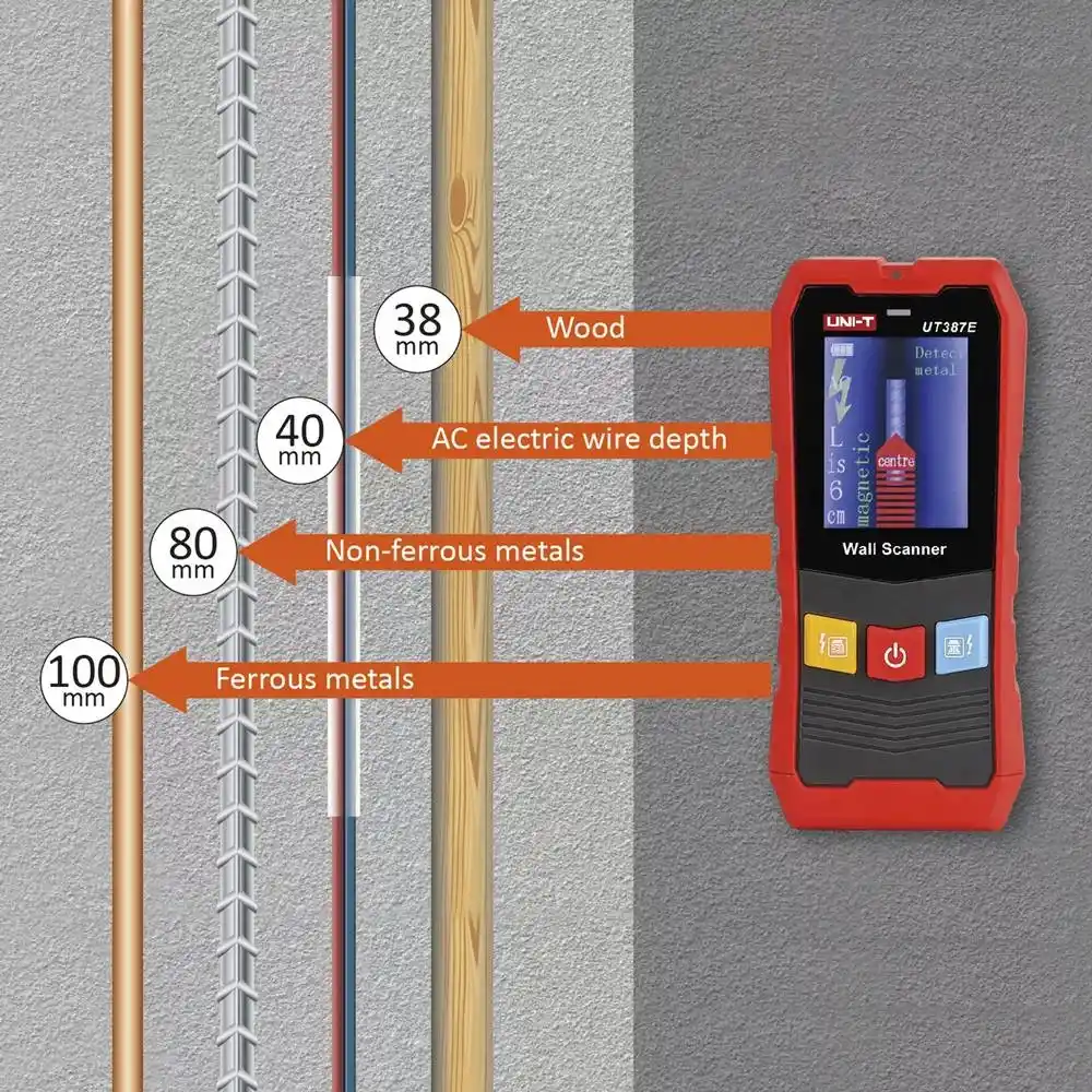 Uni-T UT387E, duvar arkasındaki metal boru, ahşap kiriş ve elektrik hatlarını elektromanyetik indüksiyon ve kapasitif sensörler kullanarak tespit eden, yüksek çözünürlüklü renkli ekrana sahip profesyonel bir tarama cihazıdır.