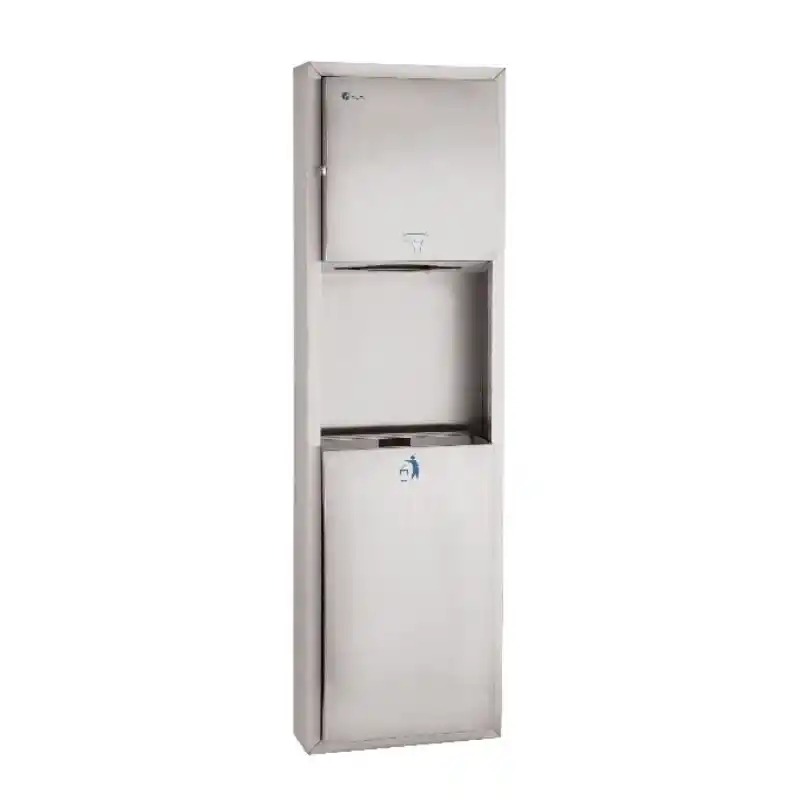 Xinda GSG63AH-S, el kurutma ve atık yönetimini tek bir dikey gövdede birleştiren "2'si 1 arada" sıva üstü bir hijyen ünitesidir. Standart düz modellerden farklı olarak, ön yüzeyindeki bombe (kavisli) tasarımı sayesinde banyolara daha yumuşak, modern ve lüks bir derinlik katar. Üst bölümünde Z veya V katlama kağıt havlular için kilitli bir dispenser, alt bölümünde ise geniş bir atık haznesi barındırır.