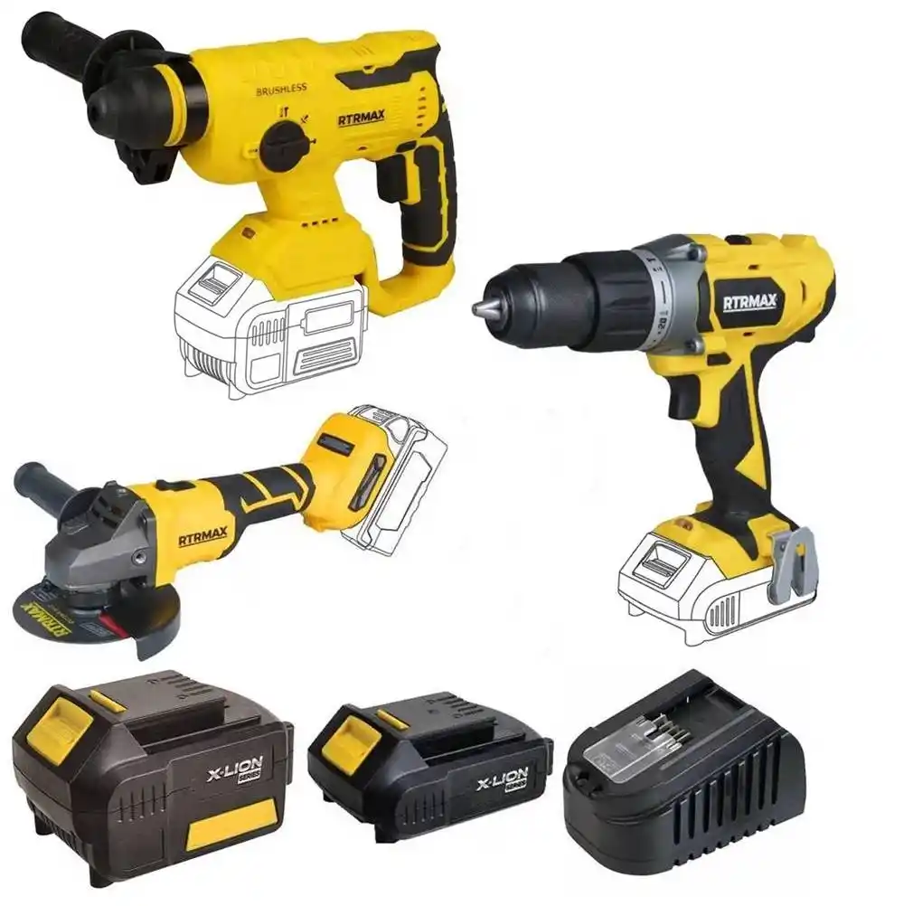Rtrmax X-Lion 3’lü Set; inşaat ve endüstriyel bakım işlerinin üç ana temel taşını (kırma, delme, kesme) bir araya getiren kapsamlı bir profesyonel çözümdür. Set içerisinde yer alan RTX2095B Kırıcı Delici, beton ve sert zeminlerde kırım/delim yaparken; RTX1820B Darbeli Matkap vidalama ve montaj işlerini, RTX2055B Avuç Taşlama ise metal ve taş kesimlerini üstlenir.